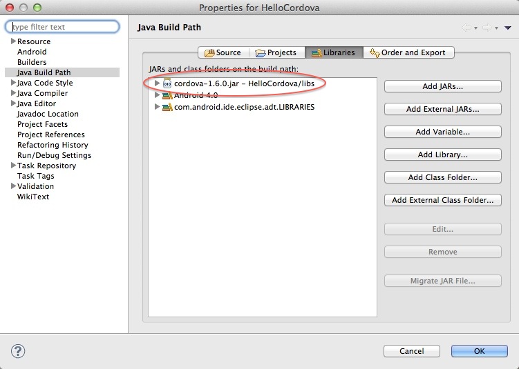 - Copy cordova-1.7.0.jar from your Cordova download earlier to /libs