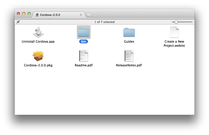 - Run the installer 'Cordova-2.0.0.pkg' to completion