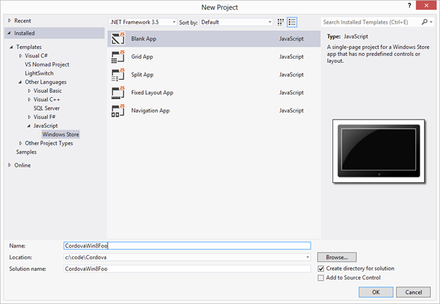 Select Installed → Template → Other Languages → JavaScript → Windows Store from the tree, and then Blank App from the projects list. Enter whatever project name you like, such as