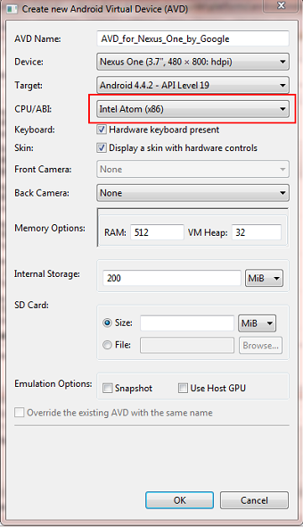 Once installed, in order to test it, create new a AVD with the CPU/ABI set to an Intel (Atom) x86 Image: