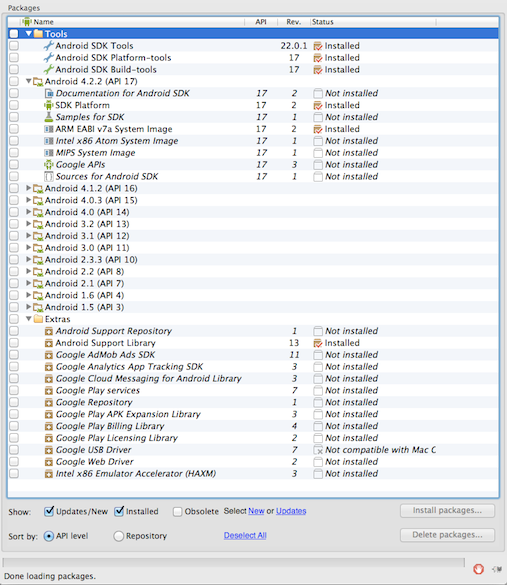 Install the Android SDK from developer.android.com/sdk. The android sdk is distributed as an 'adt-bundle-<os>-<arch>-<ver>' file. On windows, the adt-bundle is packaged with an installer. On OSX and Linux, simply unpack the 'adt-bundle' in the location you store development tools. More detailed information on Android SDK setup can be found here