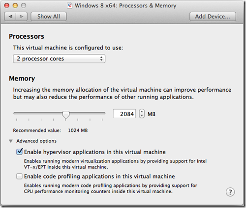 Choose the Processors & Memory configuration options. Make sure to specify two processor cores, and to Enable hypervisor applications in this Virtual machine: