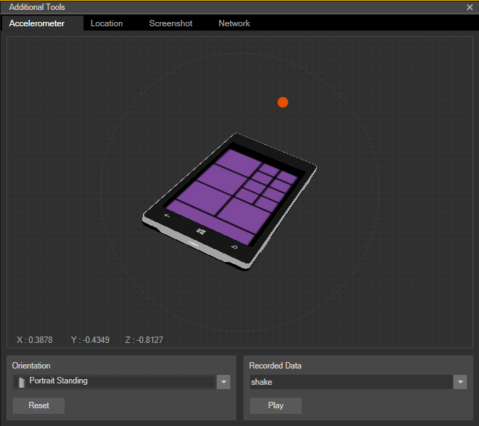 The emulator's basic controls on the top-right of the device screen allow you to toggle between portrait and landscape orientation. The » button opens more controls that allow you to test more complex orientations and gestures: