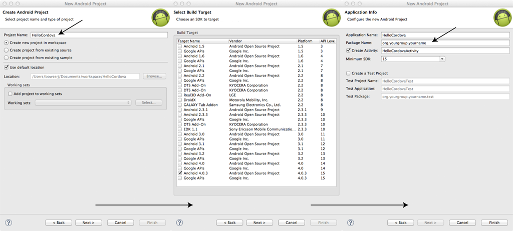 Launch Eclipse, and select menu item New > Android Project. Fill out the three panels of the New Android Project wizard shown below.