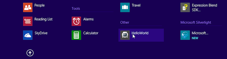 With Local Machine selected, press the green arrow to install the app on the same machine running Visual Studio. Once you do so, the app appears in Windows 8's app listings: